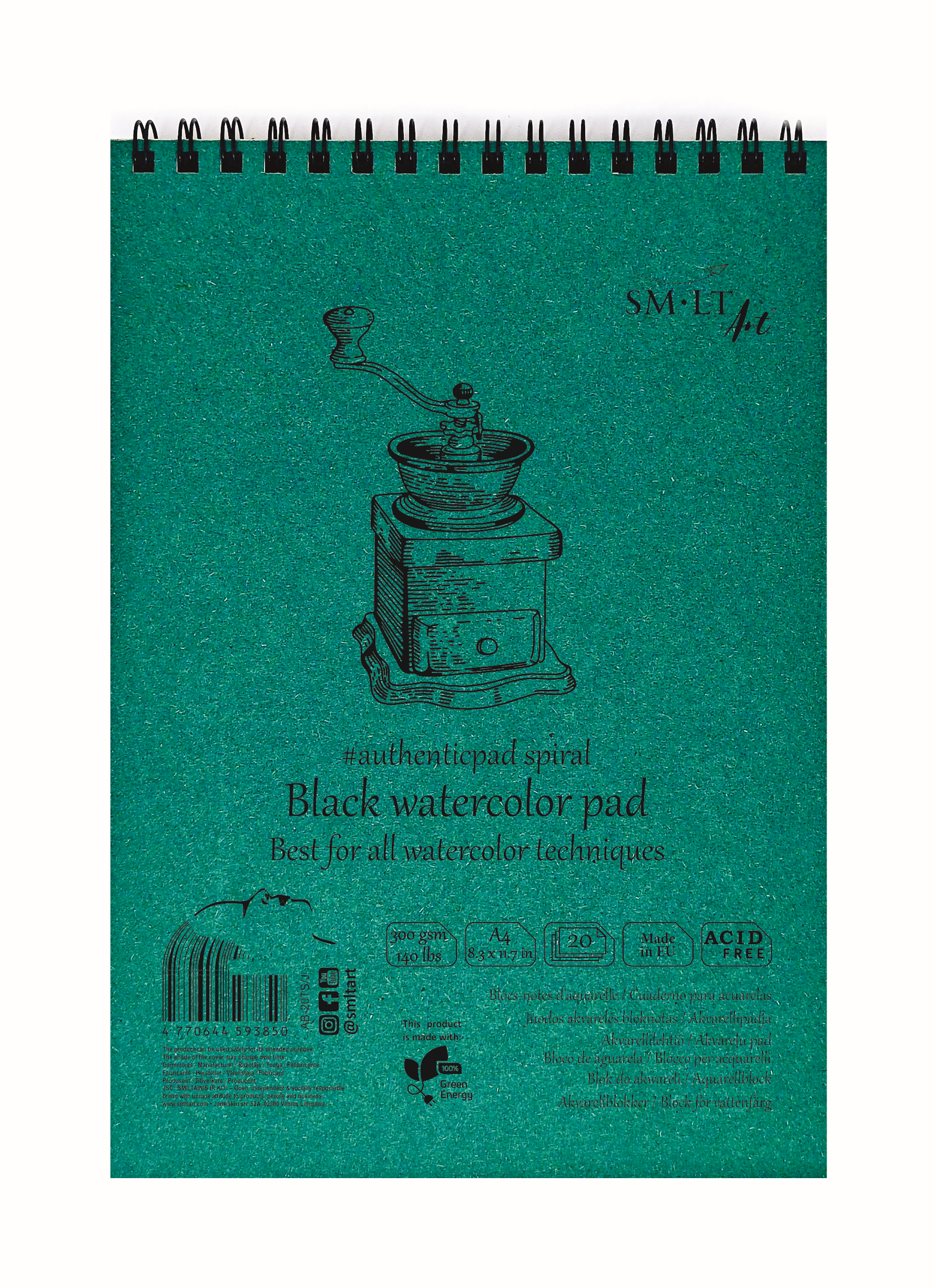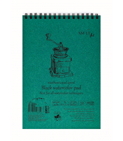 With unique cellulose based black watercolor paper. Best for watercolors, gouache, colored pencils and pastels. Inside paper is Acid-free and FSC certified. With natural colored cardboard cover, hard back, microperforated sheets and spiral on top.