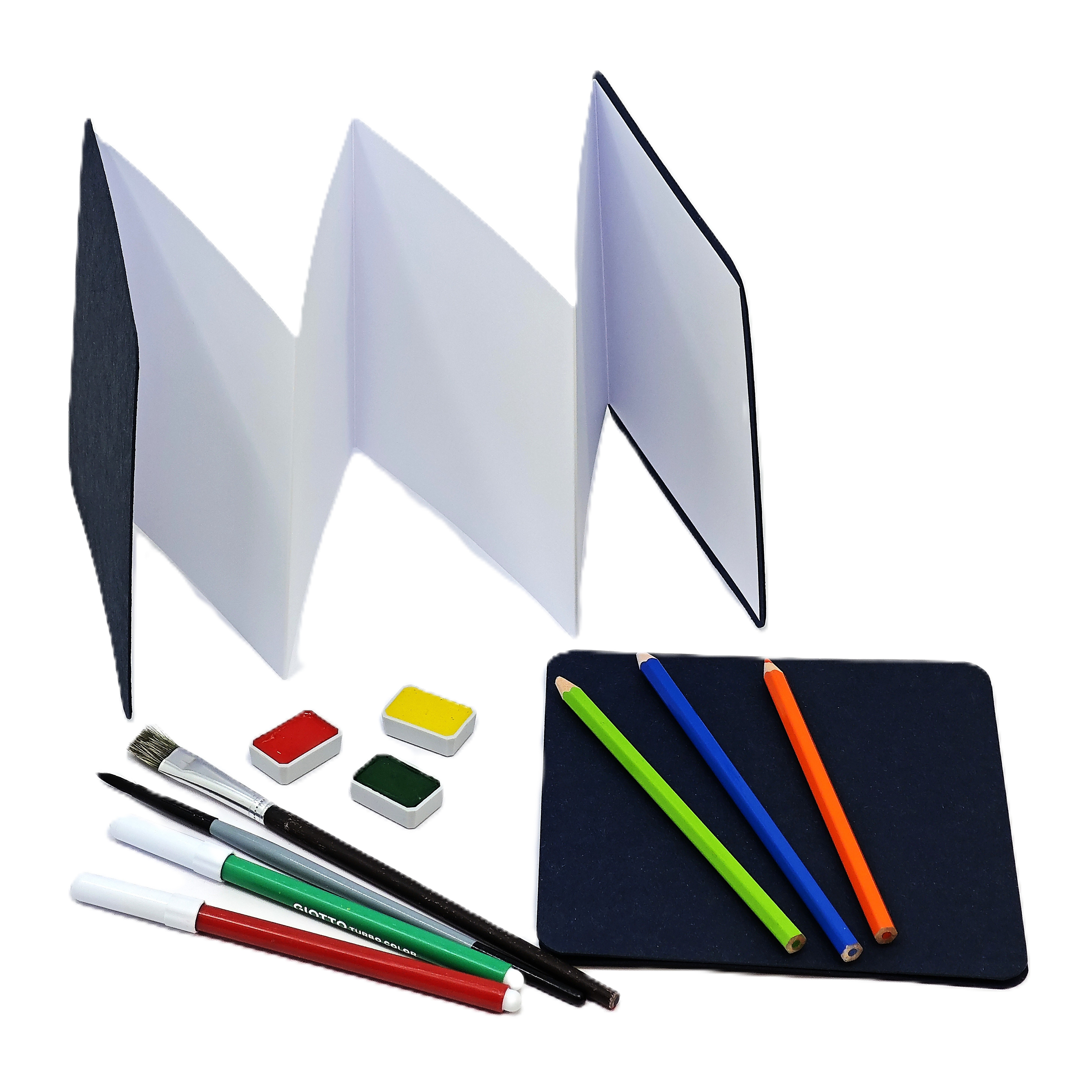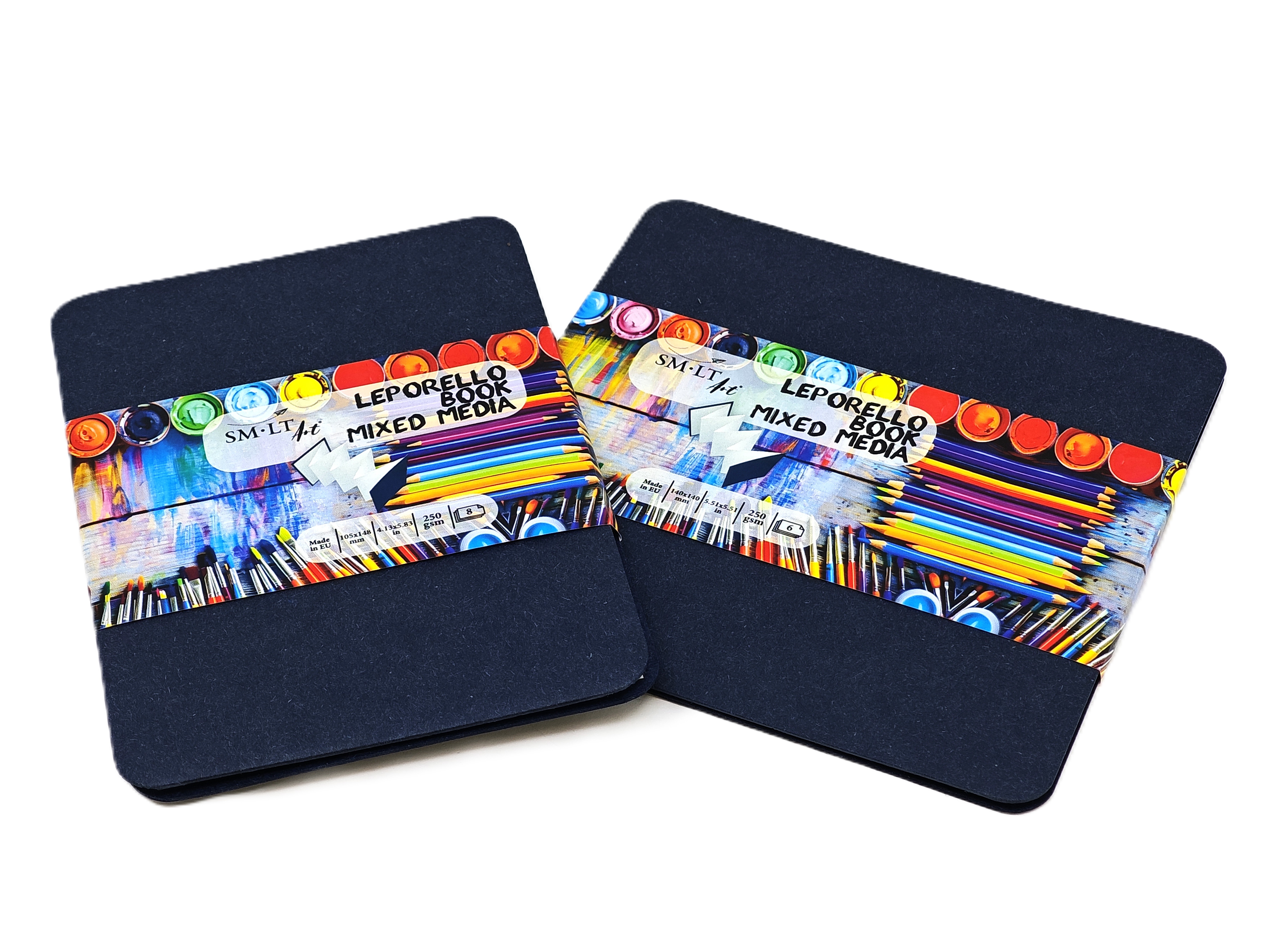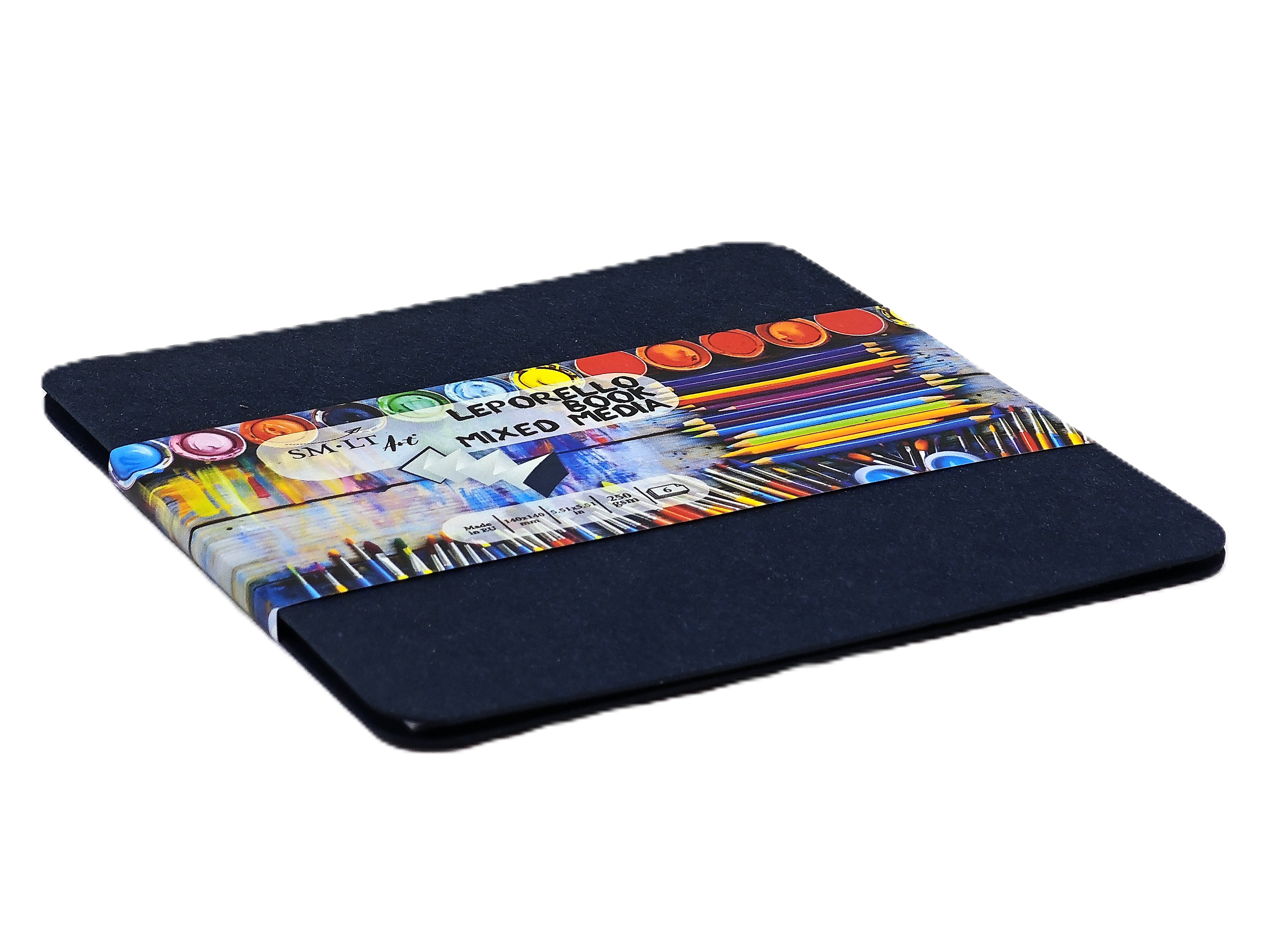 White, medium-grit, cold-pressed universal paper. Suitable for both dry and wet drawing techniques. The inner paper is acid-free, pH neutral. With blue cardboard covers. Available in two sizes: 140x140 mm with 6 sheets and 105x148 mm with 8 sheets.