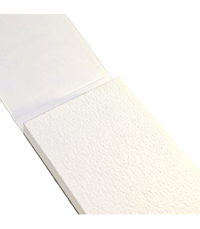 With white medium rough (cold pressed) universal paper. Suits for all drawings techniques, both - dry and wet. Inside paper is Acid-free, pH Neutral and FSC certified. Glued, with hard back cover.